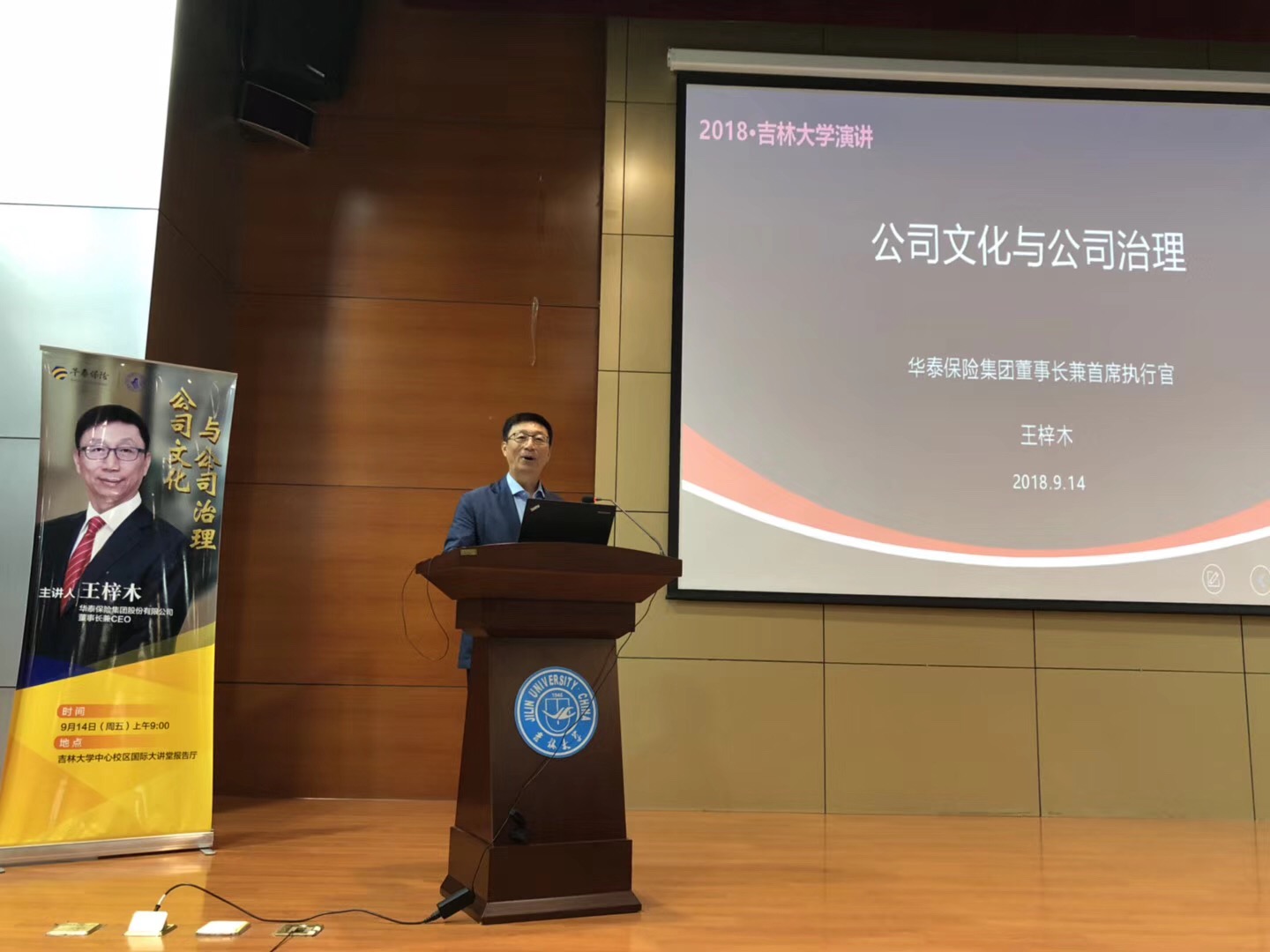 9月14日上午,华泰保险集团董事长兼首席执行官王梓木先生应邀回母校,在中心校区国际大讲堂报告厅作了一场题为“公司文化与公司治理”的学术报告,002cc白菜资讯党委书记陈密主持了报告会。王梓木董事长夫人、央视著名主持人敬一丹老师,002全讯白菜大全北京校友会会长林学访、副会长王亚力,002cc白菜资讯副院长史本叶、王倩和秦川出席了报告会,华泰保险集团部分高管、吉林分公司员工以及002cc白菜资讯师生150多人参加了报告会。
