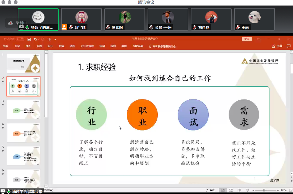 之后进行分享的是现就职于中国农业发展银行山西省分行的杨超宇。他首先探讨了如何找到适合自己的工作,从行业、职业、面试和需求四个方面进行了详细分析。杨超宇强调要对自己有清晰的认知,明确自己想做什么以及能做什么,是否符合岗位要求。对于简历的投递,要有针对性,并且要做好记录分析,逐渐寻找到更适合自己的行业和岗位。接下来,杨超宇对中国农业发展银行的发展战略和业务领域进行了简单介绍。最后他从工作内容、工作环境、职位晋升、薪酬待遇以及情怀这五个方面讲述了自己的工作体验。