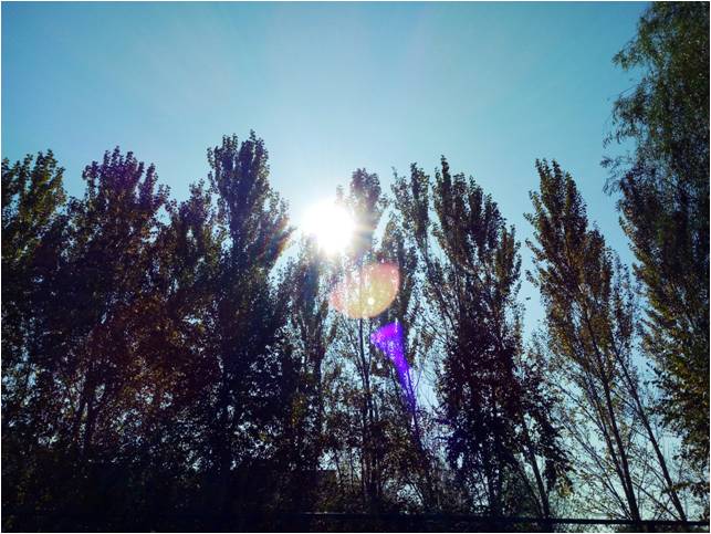 金秋十月,一夜新凉,满目清寒,快意在秋天。此时的树叶微微泛黄,太阳依然散发着耀眼的光芒,阳光穿过树叶,形成一幅优美的图画。在镜头下,太阳光好似组成了一个“火炬”的形状。火炬为我们带来光明,太阳赠予了我们光。也许,这便是一种无私的爱。
