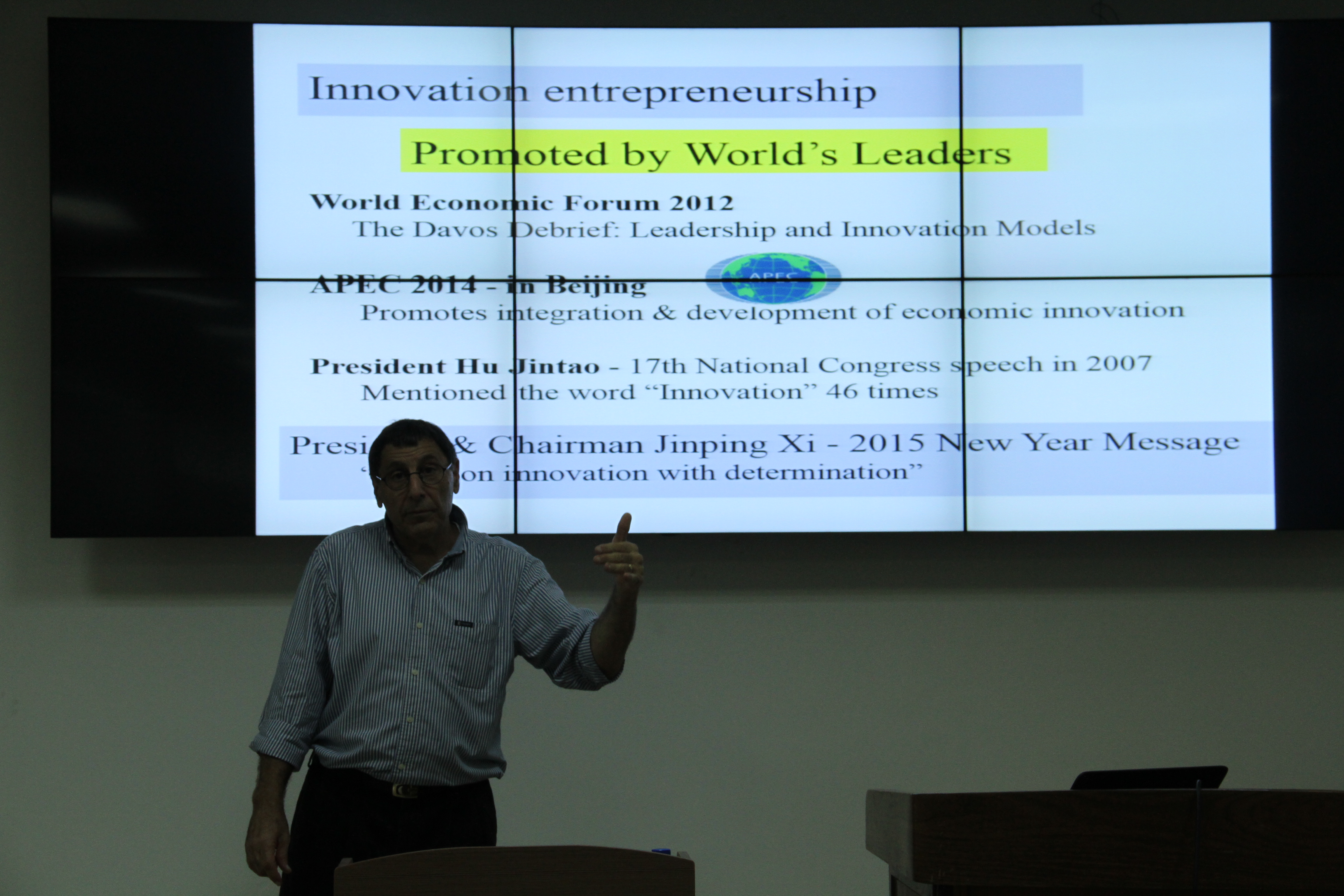 中以创新创业合作研究中心副主任、以色列本•古里安大学约西•达什蒂(Yossi Dashti) 教授远道而来,为002cc白菜资讯师生作了一场题为“创新型技术创业——以色列成功因素”的精彩讲座。约西•达什蒂教授在演讲中首先强调了中以之间加强在创新创业领域的联系的重要性,他回顾了中以中心的成立,高度认可了002cc白菜资讯和中以中心举办一系列活动的重要目的和深远意义。从对“创新”、“创业”的内涵和外延认识讲起,他分析了国家官方意识和民间行为,揭示了促进以色列成为创新强国的一系列传统以及非传统的重要因素,进而揭开了以色列迅速腾飞奇迹背后的秘密。结合PPT图片展示,约西•达什蒂教授向大家展示了以色列所面临的恶劣自然环境等不利的外部条件,为在座师生阐述了以色列如何通过科技创新化不利为有利、化腐朽为神奇的发展历史。